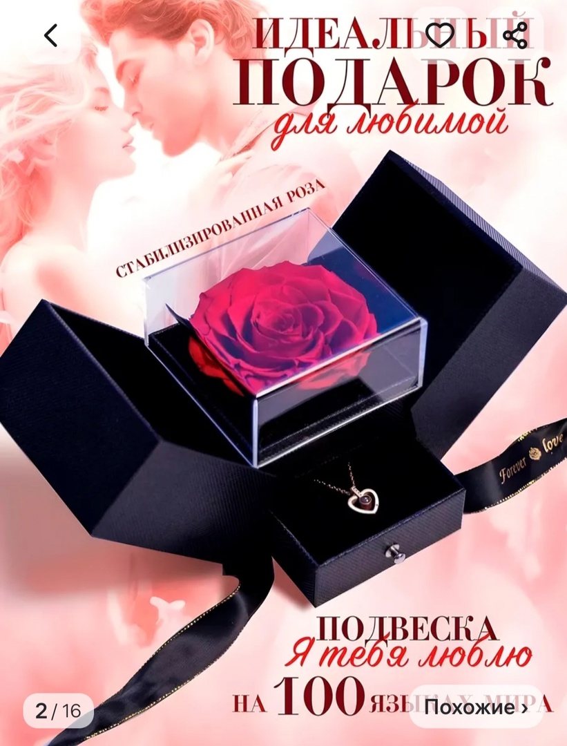 В красивую шкатулку упаковано сразу три сюрприза. Первый- стабилизированная роза в стекле, цвет можно выбрать. Второй – открытка с приятными пожеланиями. И третий, самый необычный, - кулон в форме сердечка. Если навести на него камеру телефона или фонарик, то на экране гаджета вы увидите фразу «Я тебя люблю» на 100 языках мира. Стоимость такой коробочки от 2500 рублей.