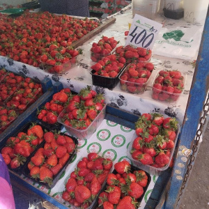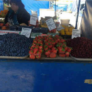 «Королева» рынка сейчас, конечно, клубника. Прилавки завалены спелой ягодой. Продавцы утверждают, что вся клубника местная – Белореченская, Холмская, Абинская. Несмотря на это, цены «штормит». Самая дешевая стоит 180 рублей за килограмм. Правда, внешний вид ягоды оставляет желать лучшего. Ценник доходит до 650 рублей. Хотя и по 350-400 рублей за кило можно найти идеальную сладкую клубнику.