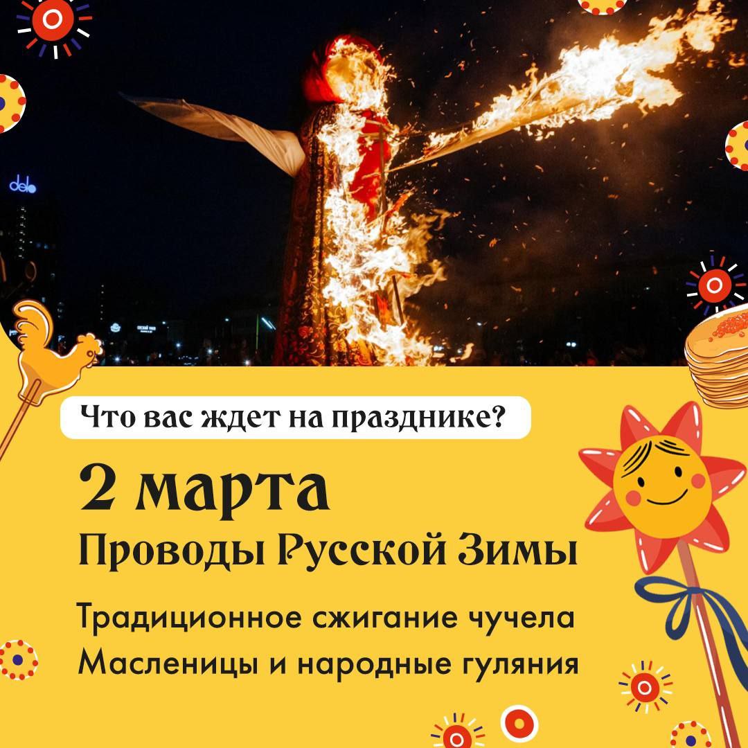 Заключительный день праздника, 2 марта, обещает стать ярким событием. В этот день состоится заключительное шоу «Проводы Русской зимы», где можно будет увидеть танцевальные выступления, бродячую анимацию, а также древние обряды, кульминацией которых станет традиционное сжигание чучела Масленицы.