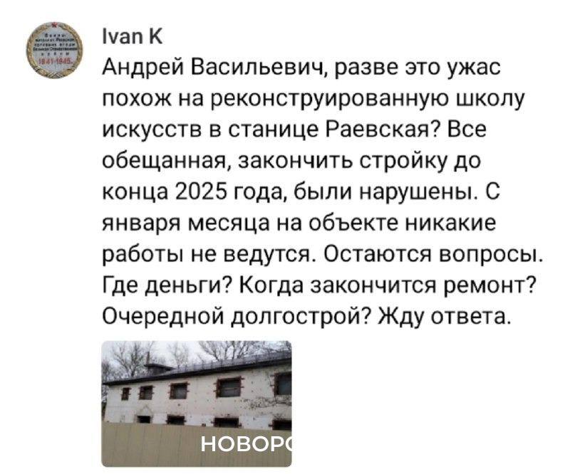 Жители станицы Раевская, расположенной под Новороссийском, обеспокоены продолжительными задержками в ремонте местной школы искусств. Работы, которые должны были быть завершены до 2025 года, фактически приостановлены, а здание школы выглядит заброшенным, сообщает «НР».