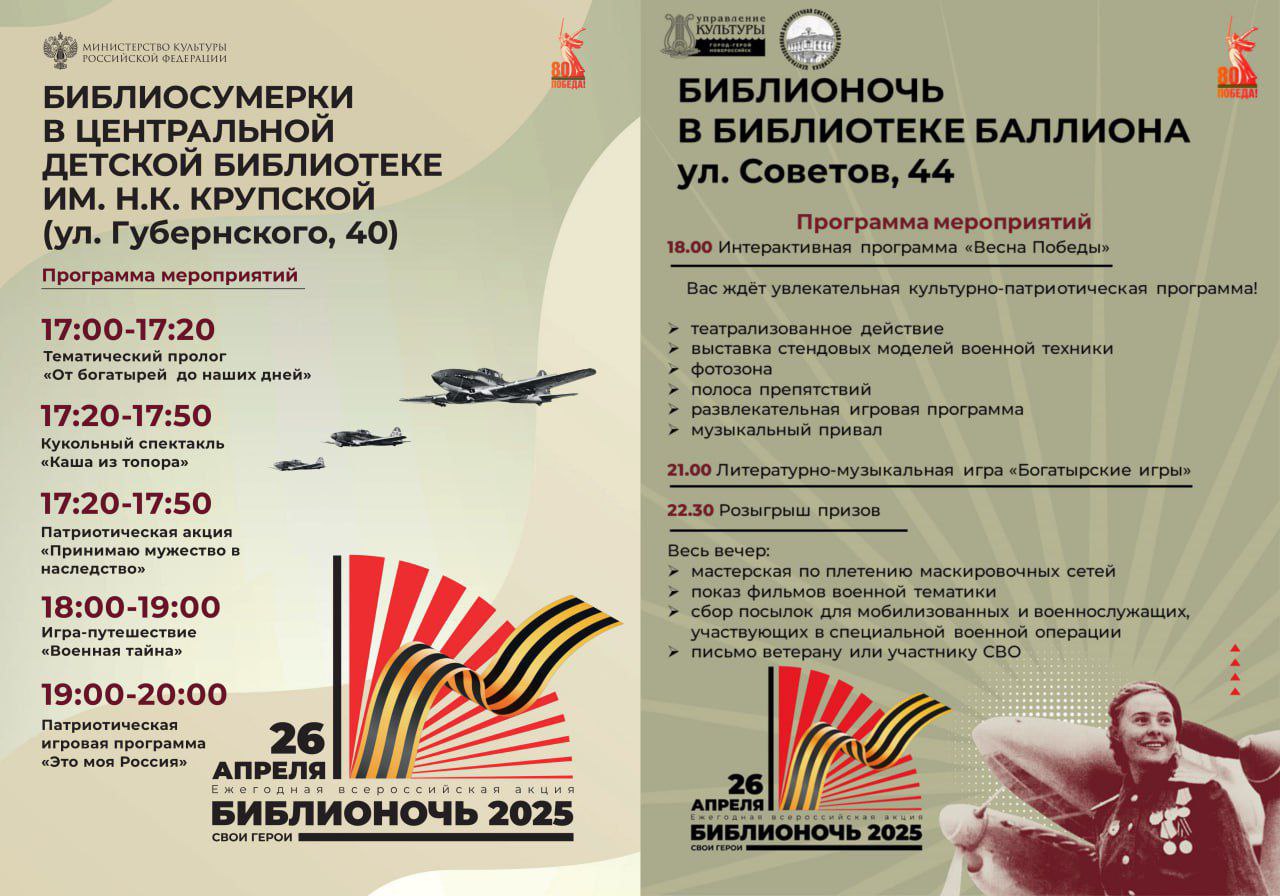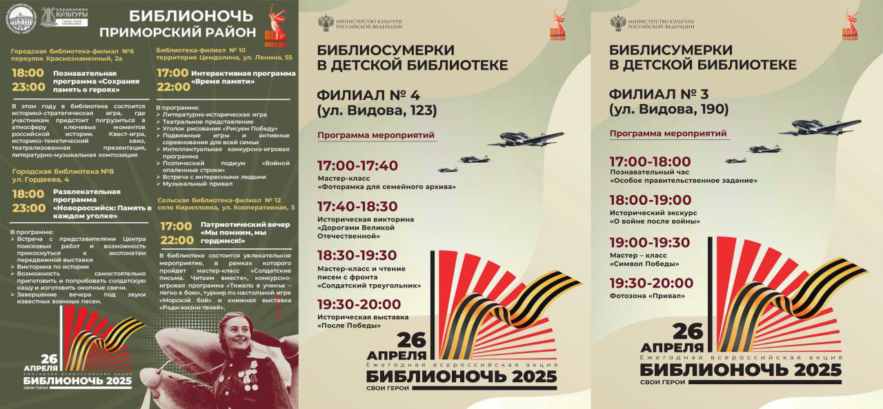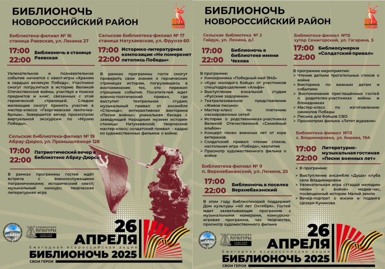 26 апреля в Новороссийске всостоится Всероссийская акция «Библионочь». В этом году она пройдёт под вдохновляющим девизом «Свои герои», объединив городские библиотеки в масштабный культурный марафон. Вечером привычные читальные залы полностью преобразятся: книжные полки станут декорациями, а каждая площадка — отдельной главой живой истории, посвящённой тем, кто оставил след в жизни страны, края и самого Новороссийска.