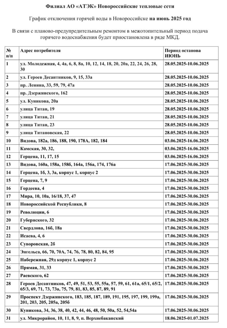 Две недели без горячей воды: график отключений в Новороссийске на июнь