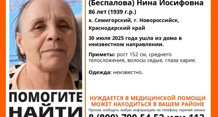 В хуторе Семигорье под Новороссийском пропала 86-летняя Александрова (Беспалова) Нина Иосифовна. Старушка вышла из дома 30 июля 2025 года и не вернулась. С тех пор ее местонахождение неизвестно. Родственники сообщают, что пенсионерка страдает деменцией и нуждается в медицинской помощи. К поиску женщины подключились волонтеры отряда «Лиза Алерт».