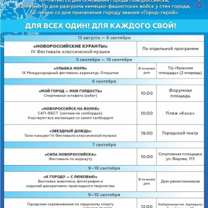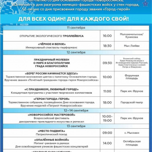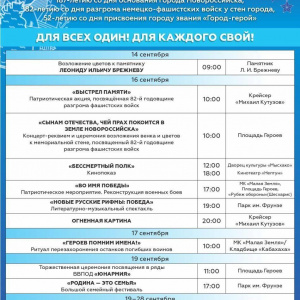 Праздничные мероприятия продолжатся в парках города и на площадках всех внутригородских районов. Вечером в городском театре состоится торжественная церемония вручения медалей «Патриот Новороссийска» людям, внесшим значительный личный вклад в развитие и процветание города. 16 сентября в 10:00 утра выстрел с крейсера-музея «Михаил Кутузов» возвестит о начале памятных мероприятий, посвященных 82-й годовщине разгрома немецко-фашистских войск у стен города. На площади Героев пройдут концерт-реквием и возложение цветов к мемориальной стене «Сынам Отечества, чей прах покоится в земле Новороссийска».