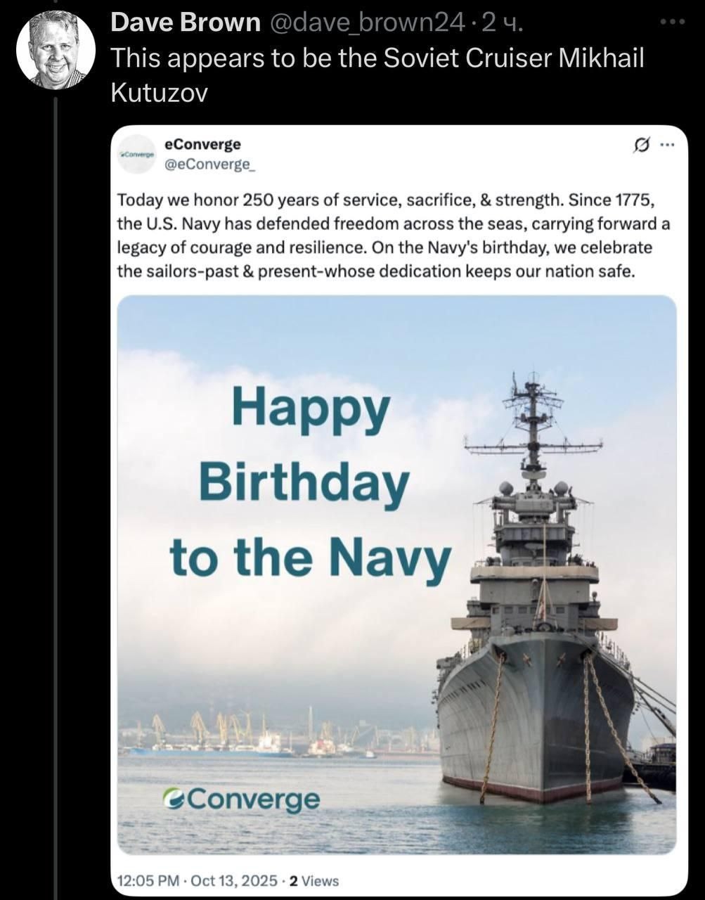Американские пользователи, в том числе Национальный морской музей США поздравляют военный флот США с 250-летием картинками с российскими кораблями. На это обратил внимание в соцсетях журналист «The Wall Street Journal» Дэвид Браун. Среди американских поздравительных открыток есть и карточка с изображением крейсера «Михаил Кутузов», который сейчас является визитной карточкой Новороссийска и выполняет роль музея. Об этом сообщил в своем телеграм-канале корреспондент Кремлевского пула Александр Юнашев.