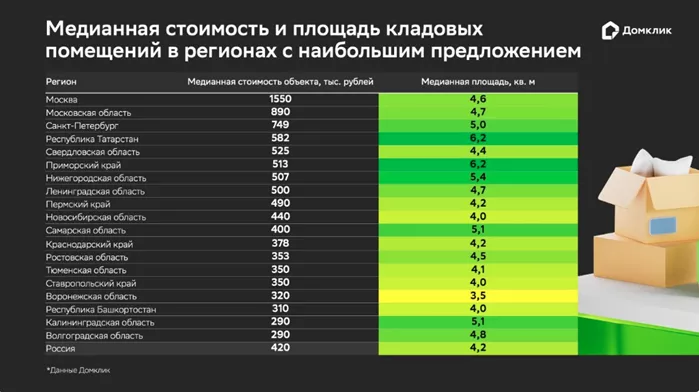 При этом на юге можно приобрести кладовые преимущественно с небольшой площадью: Ростовская область – 4,5 кв.м, Краснодарский край – 4,2 кв.м, Ставрополье – 4 кв.м. Регионами с самыми большими помещениями для хранения оказались Приморский край и Республика Татарстан (по 6,2 кв.м), а также Нижегородская область (5,4 кв.м), самые маленькие объекты предлагают в Воронежской области (3,5 кв.м).