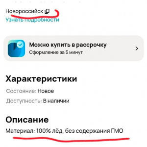 «Материал – 100% лед, без содержания ГМО. Состояние – новое, в наличие несколько штук, можно купить в рассрочку», - сообщает автор объявления. Сосульки подаются по 10 рублей за сантиметр.Так, внушительный экземпляр длиною 2 метра 10 сантиметров можно приобрести за 2100 рублей.