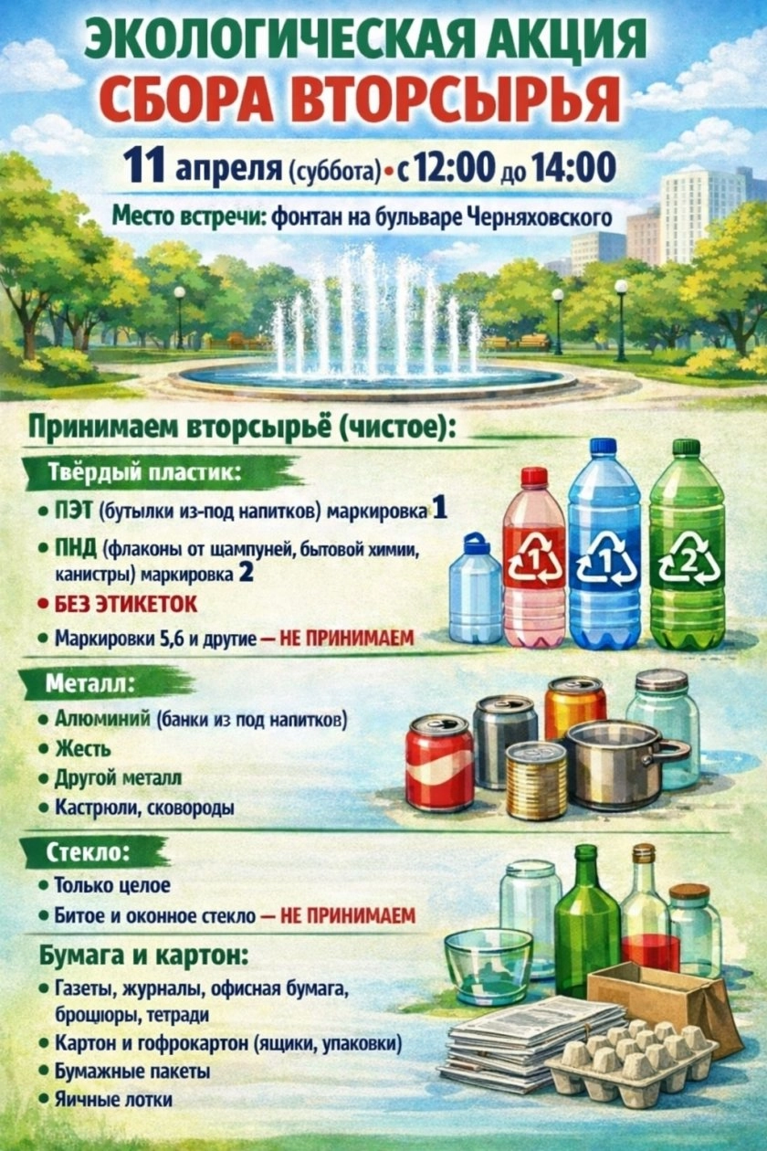 В субботу, 11 апреля, с 12:00 до 14:00 на бульваре Черняховского пройдет вторая экологическая акция по сбору вторсырья. Место встречи — фонтан напротив дома №16 по проспекту Ленина. На бульваре будут работать волонтеры в ярких жилетках с большими мешками. Каждый из них принимает только один вид вторсырья. Перед приездом тару нужно сполоснуть от остатков пищи, банки и бутылки лучше сплющить, чтобы они занимали меньше места. С пластиковых бутылок и фляг желательно снять этикетки.