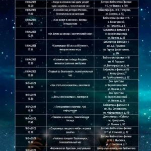 10 апреля на базах городских и сельских библиотек организуют викторины, космические квесты и кинолекции. 10 числа мероприятия пройдут в хуторе Семигорский и посёлке Верхнебаканском. 11 апреля яркие события в честь Дня космонавтики состоятся в клубах сёл Новороссийского района – Васильевки, Кирилловки, Северной Озереевки и Больших Хуторов, сообщает пресс-служба администрации города.