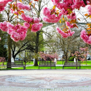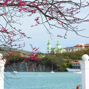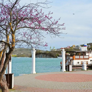 На набережной курортного поселка Абрау-Дюрсо под Новороссийском начинается цветение сакуры и церциса. Жители и гости города приезжают, чтобы устроить эффектные фотосессии: розовые и сиреневые цветы великолепно смотрятся на фоне изумрудного озера и голубого неба.