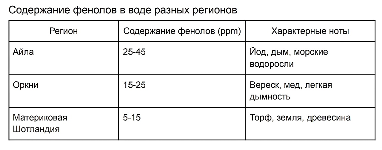 Торфяная вода содержит фенолы, лигнин и другие органические соединения. Концентрация фенолов измеряется в частях на миллион (ppm). Эти соединения создают характерные дымные, лекарственные и йодистые ноты.