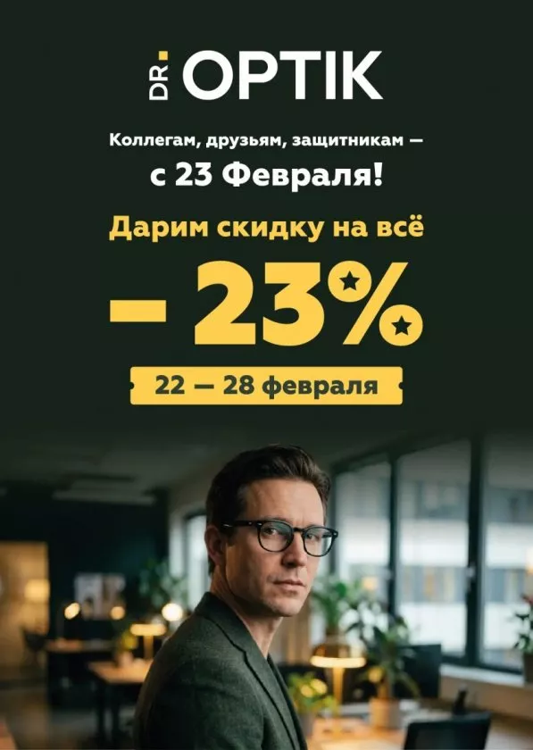 В честь 23 февраля сеть оптик Dr.Optik запускает праздничную акцию: с 22 по 28 февраля 2026 года во всех салонах действует скидка 23% на любой товар — оправы, линзы, солнцезащитные очки и контактную оптику.*