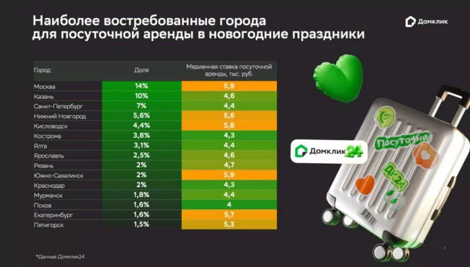 В расчёт принимались данные на 1 декабря 2025 года по квартирам, которые были забронированы через сервис Домклик24 на новогодние праздники.