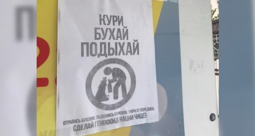 Странный призыв с листовки гласит: «Кури, Бухай, Подыхай. Отравись бухлом, задохнись куревом, умри от предоза, сделай генофонд нации чище!»