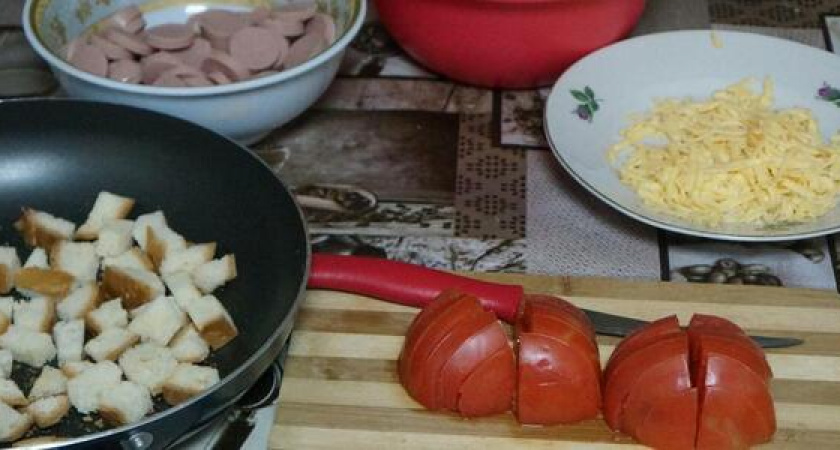 Первым делом обжарьте сосиски, добавьте томаты, в последнюю очередь – сухарики. Залейте все яйцами и в конце посыпьте сыром.