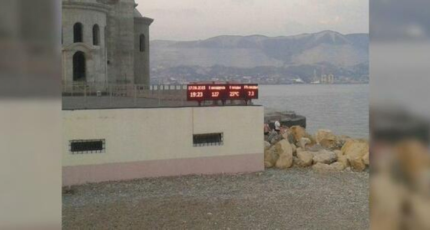 Горожан удивили и повеселили показания электронного счетчика, который висит на пляже «Нептун» в Новороссийске. Градусник показывает от 0 до 127 градусов по Цельсию.